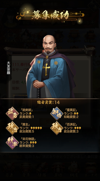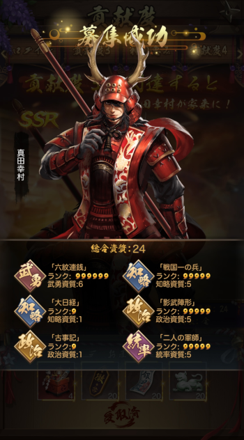 さて、今回やっと私の課金目的であった源二郎さんこと真田幸村氏を出せました。
