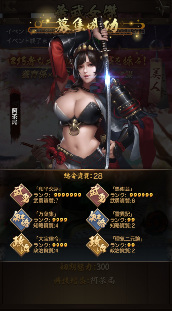 たぶん、まだ載せていない人達及び今回イベントの人達です。イベントは、今日で終わりだったような?そこそこ頑張れたから、もういいやと朝の時点で終了気分です。今回の人達、蘭丸君を除いてオッサンですね。いや、