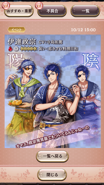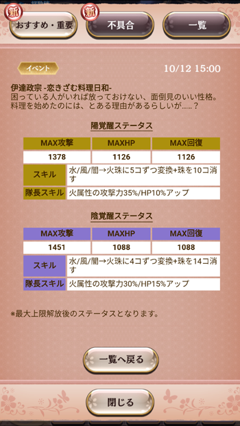 今回イベントキャラ政宗氏は、陰覚醒の方が攻撃力が強と出てましたので、陰ルートへまっしぐら。(うん、割と、政宗氏は若易いよね、うむ)