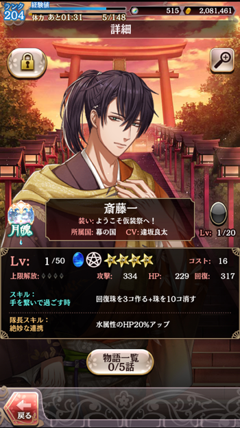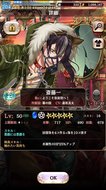 イベント(石)ガチャでもらえるキャラの1人、一君です。